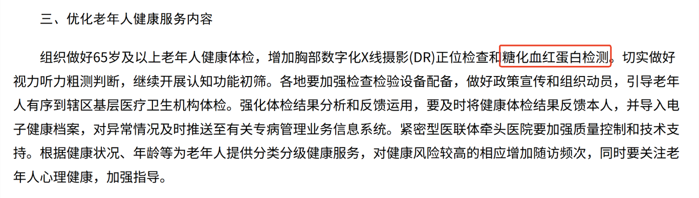 在2025年6月份发布的《关于做好2025年基本公共卫生服务工作的通知》中,建议普及65岁以上人群HbA1c(糖化血红蛋白)检查,旨在通过系统性优化公共卫生服务,由“症状控制"转向“糖尿预防",从而提升老年人健康水平。